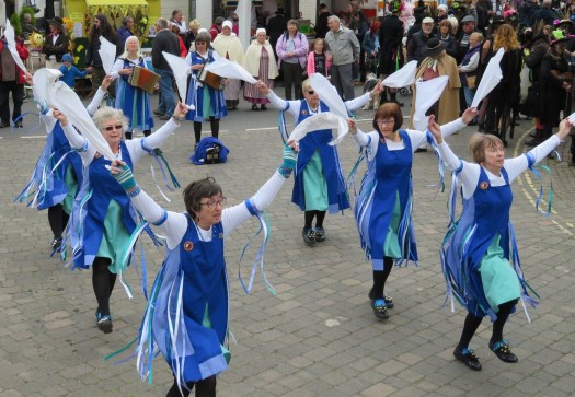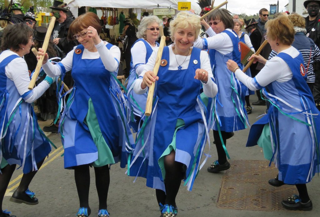 Cotswold Morris is performed with sticks and hankies and the dancers wear bells on their feet or legs. It’s associated with fine summer days, enjoying a leisurely drink outside a country pub. However, we perform our Cotswold repertoire throughout the year in all sorts of locations, from inner city schools, to church fetes, to major folk festivals, and, yes, outside beautiful country pubs.